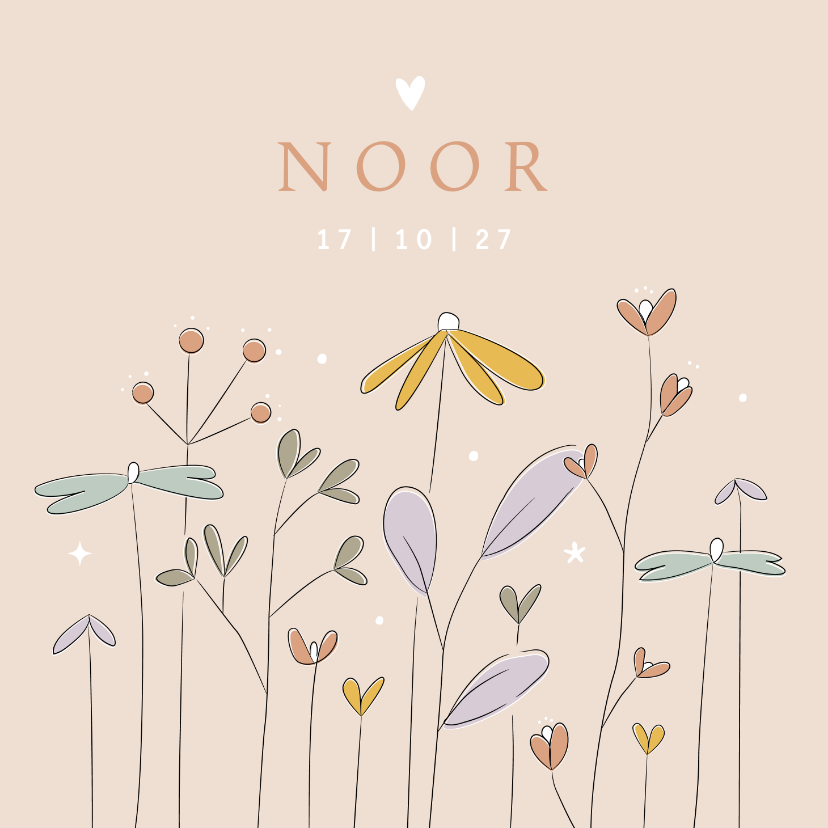 Lief geboortekaartje met stijlvolle bloemen in trendy natuurlijke pastel kleuren. Zie ook mooie binnenzijde. Eenvoudig te personaliseren.