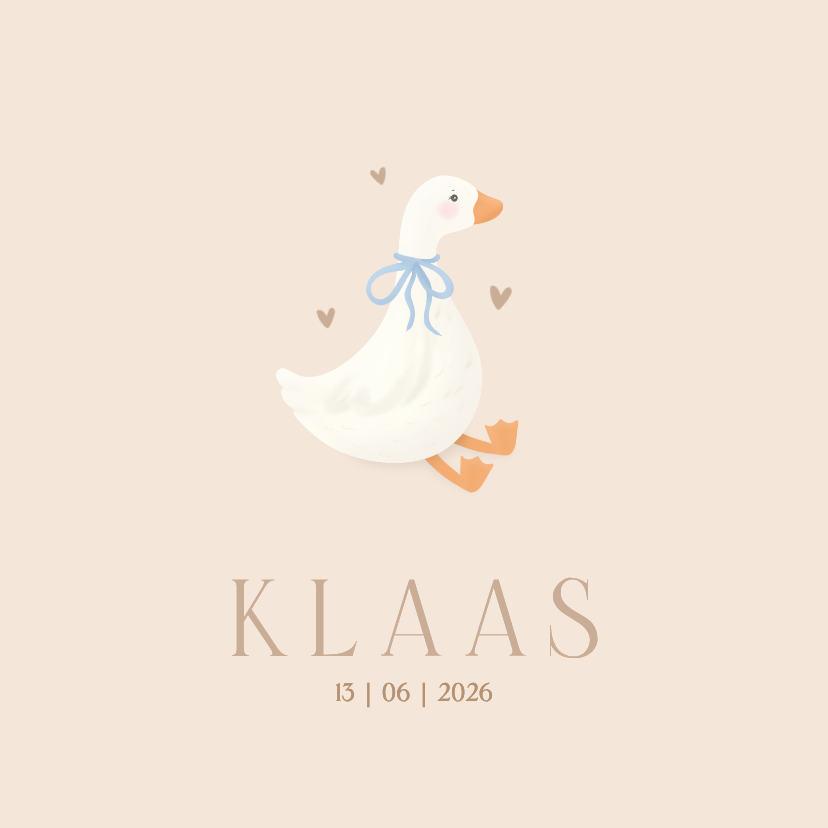 Lieve beige geboortekaartjes met zittende schattige gans met lichtblauw strik en hartjes. De typografie is klassiek en licht bruin. Voor een jongetje.