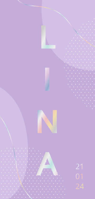Een modern geboortekaartje in trendy lila kleur met ronde vormen en lijnen. De typografie is in holografische folie. Dit kaartje valt zeker op!
