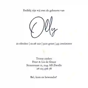 Bij Kaartje2go is het heel makkelijk om zelf een geboortekaartje te maken. Kies een geboortekaartje uit onze collectie en laat je creativiteit de vrije loop. Upload een mooie foto van jullie kleintje en pas de kaart naar wens aan. Verander de achtergrondkleur, pas de lettertypes aan of vergroot de figuren.