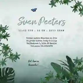 We hebben ons een weg door het oerwoud geslagen en de mooiste jungle geboortekaartjes voor je verzameld. Kies je favoriete kaartje uit en wijzig eenvoudig de geboortegegevens. Ook kun je in onze kaartmaker leuke persoonlijke touches toevoegen, zoals een foto van de kleine spruit of een lief gedichtje. Ben je in een creatieve bui? Ga dan zelf aan de slag en tover een blanco- of fotokaart om tot een jungle geboortekaartje.