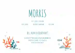 Heb je zeeën van inspiratie? Maak je geboortekaartje dan helemaal zelf! Gebruik een blanco kaart of fotokaart als canvas en laat de creativiteit uit je stromen. Voeg naast een illustratie van een zeedier een oceaan of strand als achtergrond toe, kies een mooie plek uit voor een tekstvak en upload één of meerdere foto’s van jullie kleintje. Maak het geboortekaartje helemaal af door kaders en grappige figuren als schelpen, koraal en hartjes toe te voegen.
