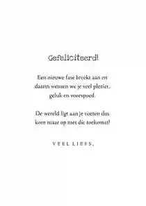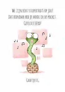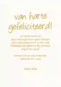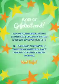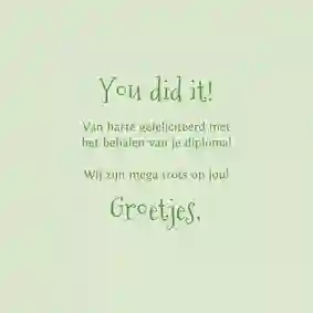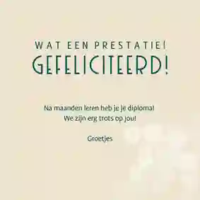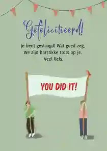 Vaak horen leerlingen al via via wat de uitslag is, maar is het behalen van het diploma nu officieel gemaakt? Dan kan de kaart op de post, eventueel met een klein presentje. Neus tussen onze geslaagd cadeaus en voeg een cadeaubon, lekkere reep chocola of een ballon met ‘hoera’ aan de bestelling toe. De bezorger doet de kaart samen met het cadeau bij de geadresseerde in de bus. Liever de felicitatiekaart persoonlijk overhandigen? Laat de kaart thuisbezorgen en stop een handje confetti of een schoolfoto in de envelop.