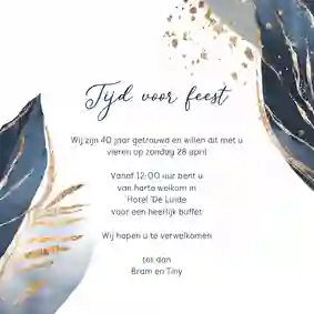 De mooiste jubileumkaarten voor 40 jaar huwelijk maak je eenvoudig en snel. Je kiest de uitnodiging die het beste past bij jullie en de liefde die jullie voor elkaar voelen. En vervolgens kun je in de kaartmaker persoonlijke details toevoegen. Jullie namen bijvoorbeeld, of een lieve foto. Hoe leuk zou het zijn om een van de eerste foto’s van jullie samen op het kaartje te zetten! Je kunt hier natuurlijk heerlijk voor gaan zitten met z’n tweetjes. Maar als je je liever stort op de voorbereidingen van jullie 40 jarig jubileumfeest, dan kan dat ook. Een persoonlijke kaart voor 40 jaar huwelijk is immers zó gemaakt.