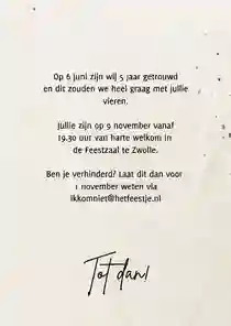 Het maken van een 5 jaar jubileumkaart is leuk, makkelijk en snel te doen. Klik op het leukste kaartje uit de galerij en kies voor ‘Kaart bewerken’. Voeg mooie foto’s, kaders en symbolen toe en maak de kaart persoonlijk. Schrijf vervolgens een liefdevolle tekst waarmee je jullie familie, vrienden of collega’s uitnodigt voor een knalfeest. Klik op verzenden en wij doen de rest!