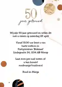 50 jaar getrouwd wordt ook wel het gouden huwelijk genoemd. Zo’n bijzondere liefdesmijlpaal verdient natuurlijk ook wel een bijzonder materiaal. Daarom bevatten veel van onze kaarten voor 50 jaar getrouwd gouden elementen. En onze ontwerpers gaan graag een stapje verder voor jullie speciale dag. Daarom hebben ze ook speciale uitnodigingen ontworpen met goudfolie! Deze fonkelende foliedruk details laten je 50 jaar getrouwd uitnodiging écht stralen.