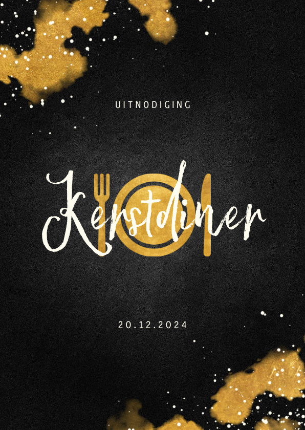 Stijlvolle uitnodiging voor een kerstdiner met een zwarte achtergrond, gouden bestek en een mooie 'kerstdiner'. Met stijlvolle gouden waterverf.