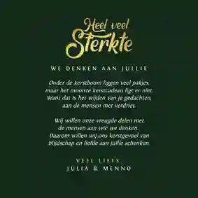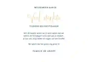 Als een vriend of familielid een dierbare heeft verloren, kunnen de feestdagen confronterend en verdrietig zijn. Op deze moeilijke momenten is een sterkte kerstkaart voor iemand in rouw een mooi gebaar. Juist wanneer medeleven het hardste nodig is, kun jij met je kerstwens een lichtpuntje in de duisternis zijn. Een kerstkaart met ‘sterkte tijdens de feestdagen’ of ‘we denken aan je’ kan namelijk nieuwe moed en kracht geven.