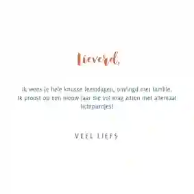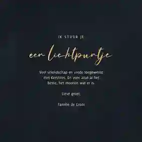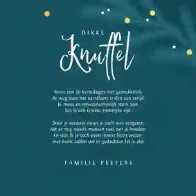 - Ga voor een warme tekst zoals ‘Een lichtpuntje voor jou’ of ‘Dikke kerstknuffel’.