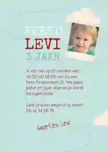 De uitnodiging van een 3e verjaardag maken is een feestje. Bij Kaartje2go kun je kiezen uit een ruime collectie aan kinderfeest uitnodigingen. Deze pas je eenvoudig en snel aan naar je eigen wensen. Schrijf bijvoorbeeld een persoonlijke tekst waarin je iets vertelt over een leuke gebeurtenis met jouw kind. En vergeet natuurlijk de datum en tijd van de uitnodiging van de 3e verjaardag niet. Personaliseer de kaart door het plaatsen van een foto of fotocollage. Voeg allerlei leuke figuurtjes toe en zo is jouw uitnodiging voor het kinderfeestje in een handomdraai gemaakt. Op zoek naar meer inspiratie? Bekijk dan ook onze uitnodigen voor een kinderfeestje voor de eerste verjaardag en tweede verjaardag. Bekijk ook alle andere uitnodigingen voor kinderfeestjes.