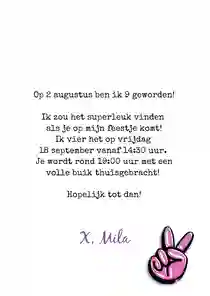 - Schrijf een bijpassende tekst aan de binnenkant. Wil je het extra leuk maken? Selecteer dan het lettertype “Happy”. Zo staat de tekst in graffiti lettertype op de uitnodiging. Tof!
