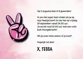 Gefeliciteerd! Jullie kind is bijna jarig en dat is reden genoeg voor een fantastisch kinderfeestje. Is het feestbeest een echte kunstenaar en gaan alle potloden, stiften en potjes verf er zo doorheen? Organiseer dan een graffiti kinderfeestje en stuur een leuke graffiti uitnodiging.