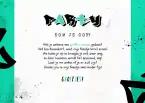 👩🎨 Tip: Goed met verf, maar iets minder met woorden? Wij tippen je heel veel leuke teksten voor op de uitnodiging van een graffiti kinderfeestje.