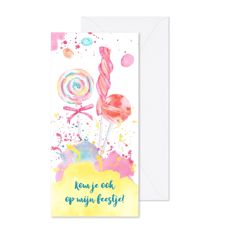 Aantrekkelijke uitnodiging voor een kinderfeestje met lolly's en snoepjes in waterverfprint in zoete kleuren. Tekst kan je helemaal zelf aanpassen.