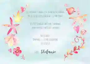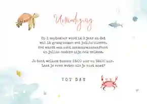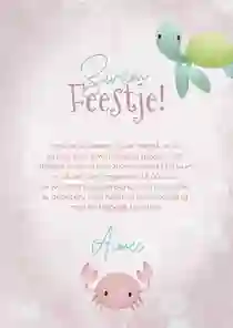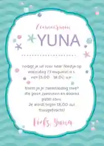 Diep in de zee, diep in de zee! Zoek je een originele zeemeermin uitnodiging? Dan hebben we een zee aan mogelijkheden. Ga bijvoorbeeld voor kaartjes met een sierlijke zeemeerminstaart, vrolijke visjes of stijlvolle schelpen. Pasteltinten als lichtblauw, lila en zachtroze brengen je nog dieper in de wondere oceaan. Wil je de uitnodiging een persoonlijke draai geven? Voeg dan een mooie foto van je kleine zeemeermin toe. Je maakt de zeemeermin uitnodiging helemaal af met vrolijke figuren als vissen, zeesterren of kwallen.