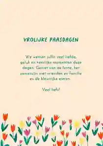 In 2026 valt Pasen op zondag 5 april en maandag 6 april. Helaas worden er op die dagen geen kaarten bezorgd. We raden je daarom aan om je paaskaart uiterlijk vrijdag 3 april 21:00 uur te bestellen. En wil je zeker weten dat hij op tijd komt, verstuur je kaartje dan het liefst nog een paar dagen eerder.