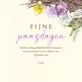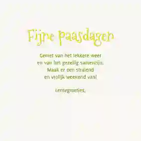 Een kaart met 'Fijne paasdagen' erop is leuk om te geven, maar met onze extra’s maak je het nog véél leuker. Zo kun je je paaskaarten bijvoorbeeld vrolijker maken met een mooie sluitzegel, gekleurde envelop of luxe papiersoort. Zo verstuur je binnen een paar hazensprongen een heerlijk feestelijke paaskaart.