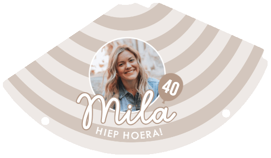 Gestreept uniseks feesthoedje beige streepjes met eigen foto, leeftijd en naam.