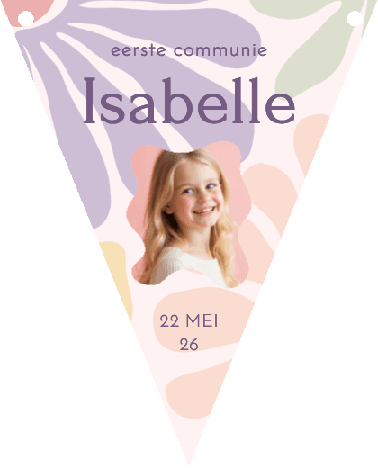 Trendy slinger voor een communiefeest met gekleurde abstracte bloemen op de achtergrond.