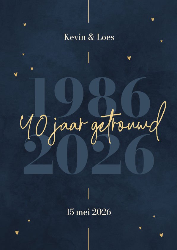 Stijlvolle poster met jaartallen op een donkerblauwe waterverf achtergrond en een gouden lijn en hartjes.