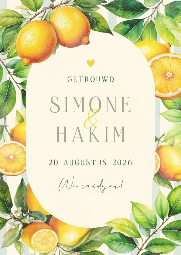 Fruitige poster trouwen met citroenen, takjes en streepjes