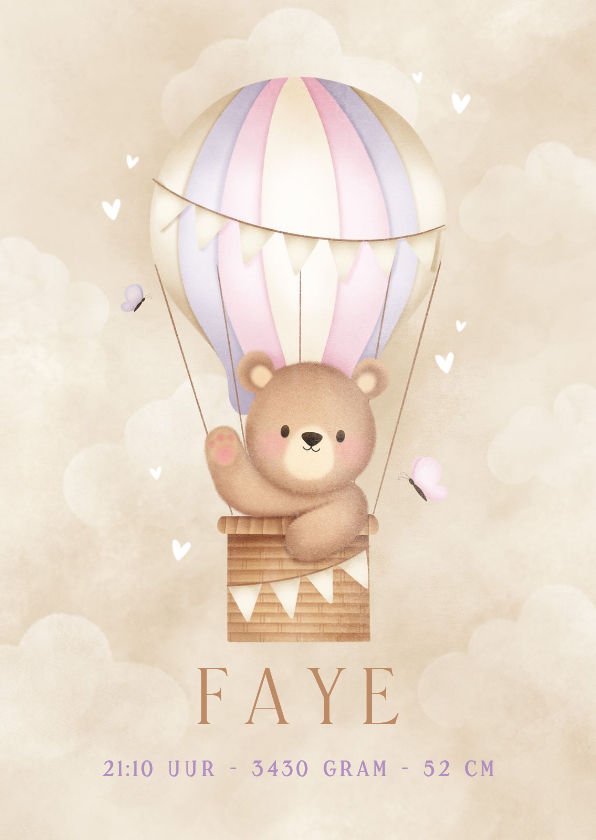 Een lieve poster voor de geboorte van jullie meisje met beertje in luchtballon met hartjes en vlindertjes