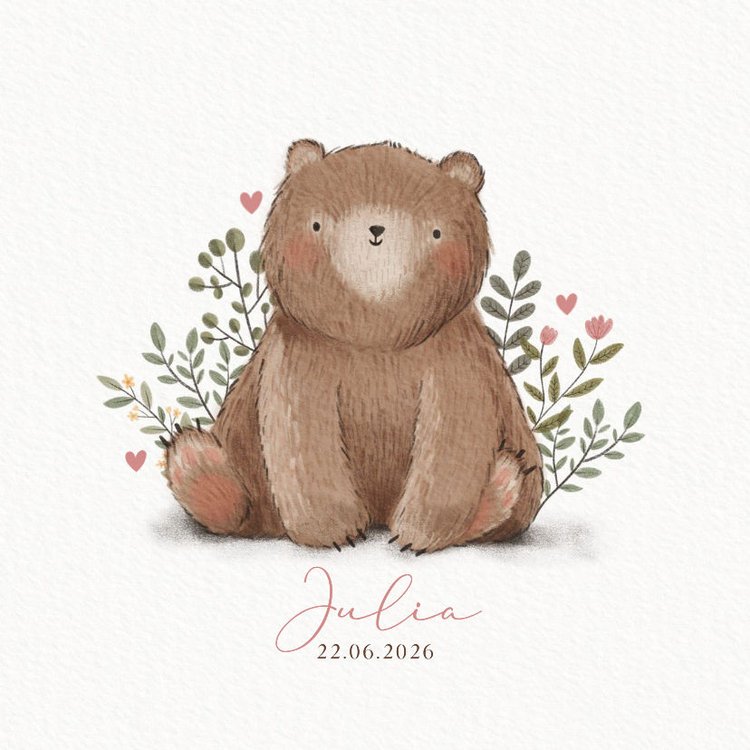 Lieve geboorteposter voor een meisje met waterverf beer met plantjes, takjes en hartjes. Voeg ook de naam en datum toe!
