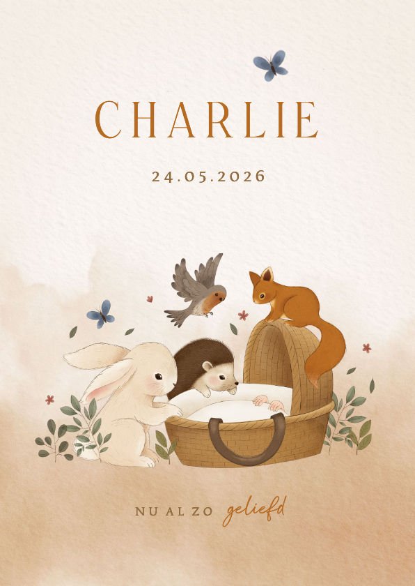 Lieve poster voor de geboorte van jullie kindje met bosdieren, konijntje, egeltje, eekhoorn en vogeltjes.