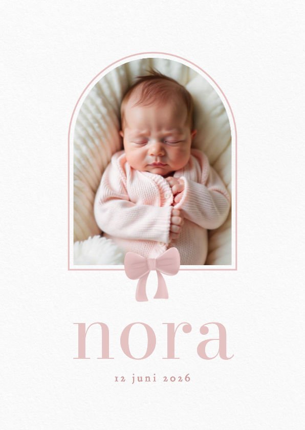 Een geboorteposter voor ene meisje. Met een foto in boog vorm en klein roze strikje.