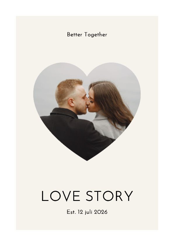 Een moderne poster met foto in hart vorm. Met de tekst love story en jullie datum.
