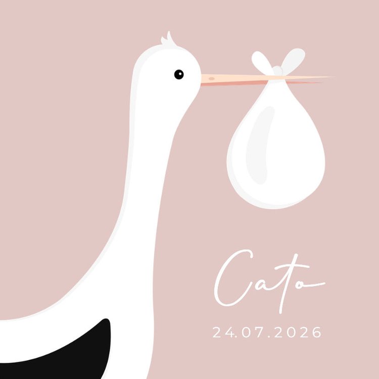 Roze vierkante poster met een leuke illustratie van een ooievaar er op. Met naam en datum.