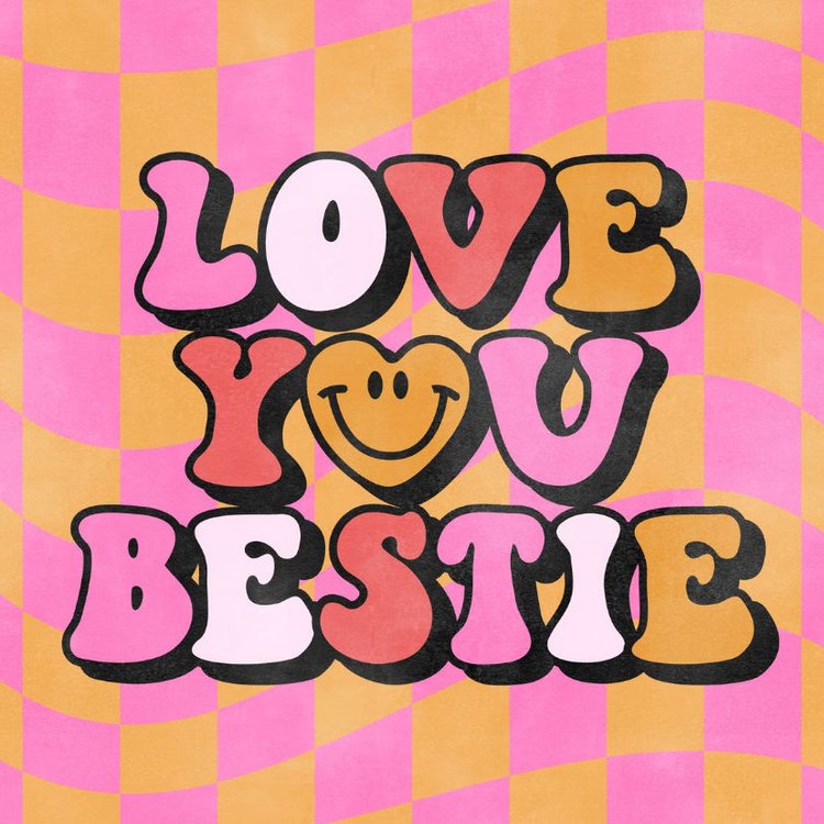 Vrolijke poster in retrostijl, voor de liefste bestie! Met een gekleurde en geblokte achtergrond en de tekst Love you bestie met een hartje.