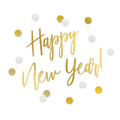 Witte sluitzegel met goudlook tekst Happy New Year en confetti