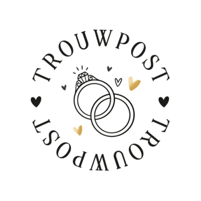 Witte sluitzegel met zwarte tekst trouwpost en illustratie van ringen en hartjes
