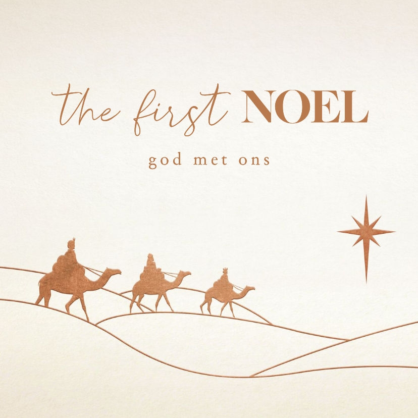 Stijlvol tegeltje met een illustratie van de 3 wijzen en de ster van Bethlehem. The first Noel.