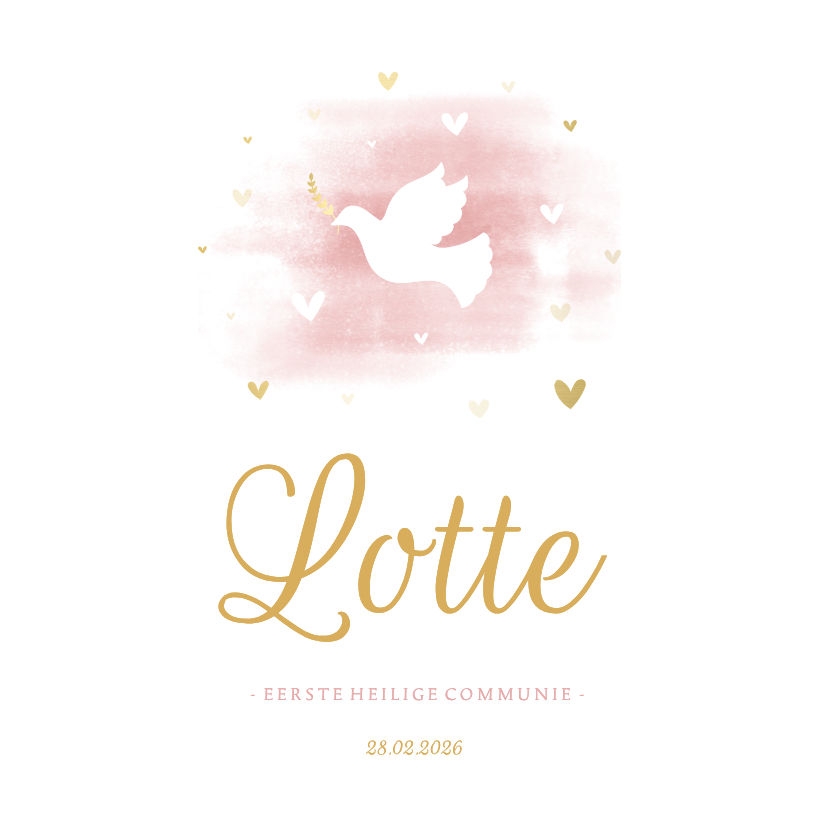 Stijlvol teegltje voor een communie met een witte duif met waterverf en een gouden takje en hartjes.
