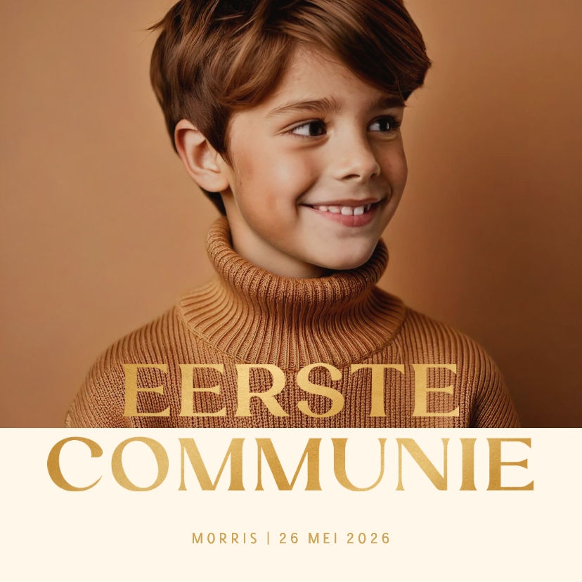 Eenvoudig maar stijlvolle tegeltje voor een communiefeest met een grote foto en gouden tekst.