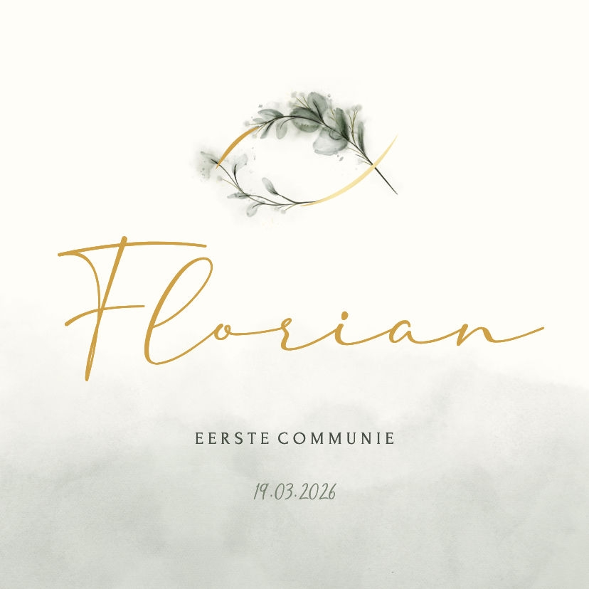 Stijlvol tegeltje voor een eerste communie met een illustratie van een Ichthus visje met takjes.