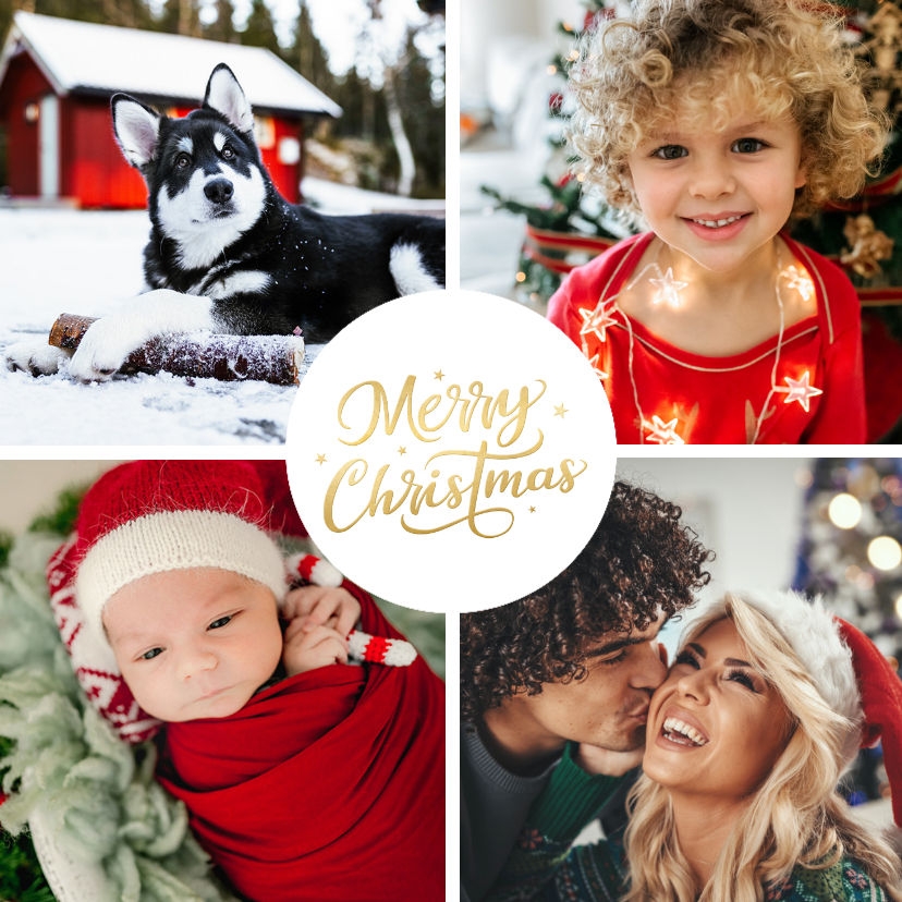 Leuk vierkant tegeltje met ruimte voor 4 eigen (kerst) foto's. Met goudlook tekst Merry Christmas.