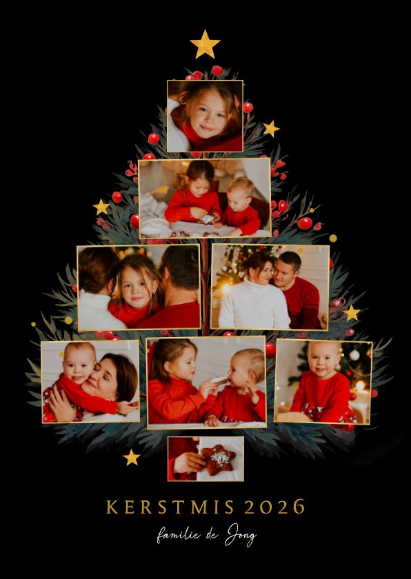Stijlvol zwart tegeltje met fotocollage van 8 foto's in vorm van een kerstboom. Aanpasbare achtergrondkleur.