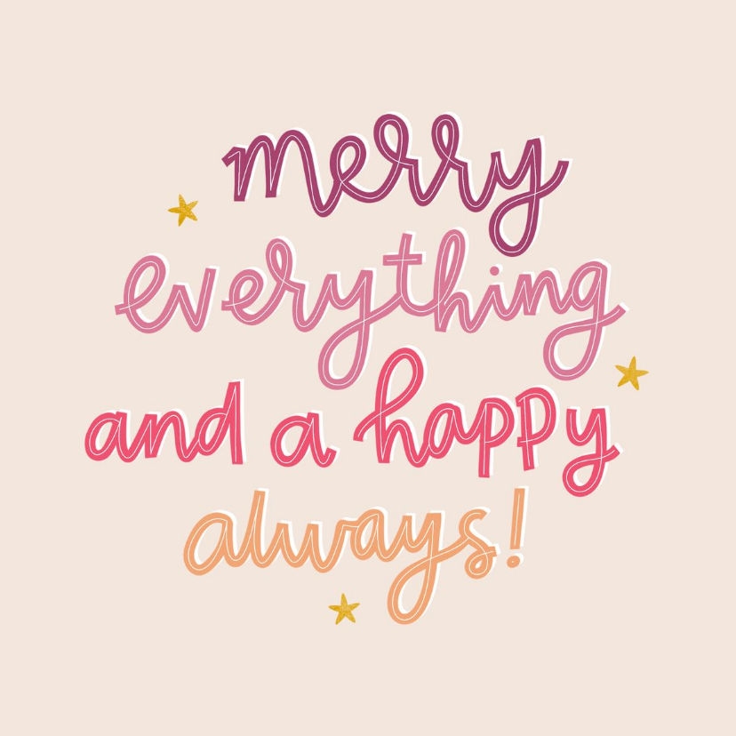 Kersttegeltje; merry everything and a happy always! In vrolijke kleuren en met sterretjes.