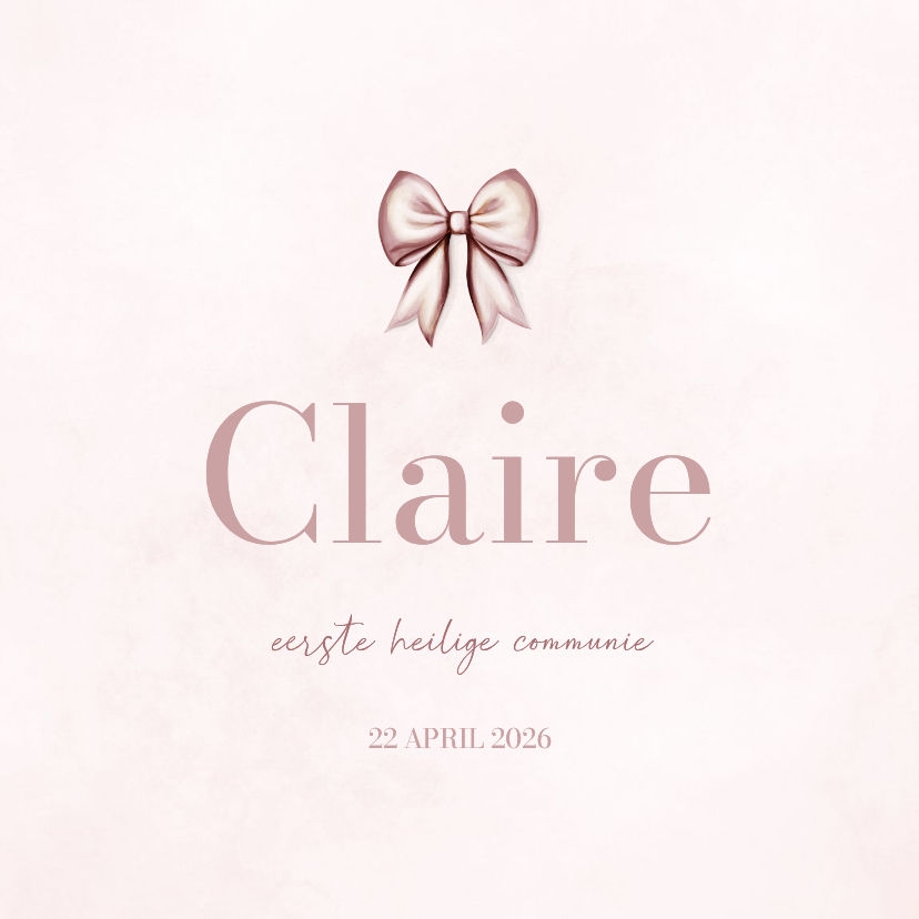 Lief en stijlvol tegeltje voor een communiefeest met eenroze strik en een lichtroze achtergrond.