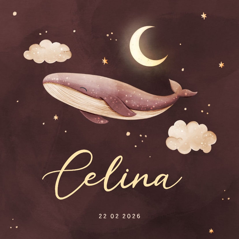 Lief tegeltje met een roze waterverf achtergrond en een illustratie van een walvis met een maan, wolken en sterren.