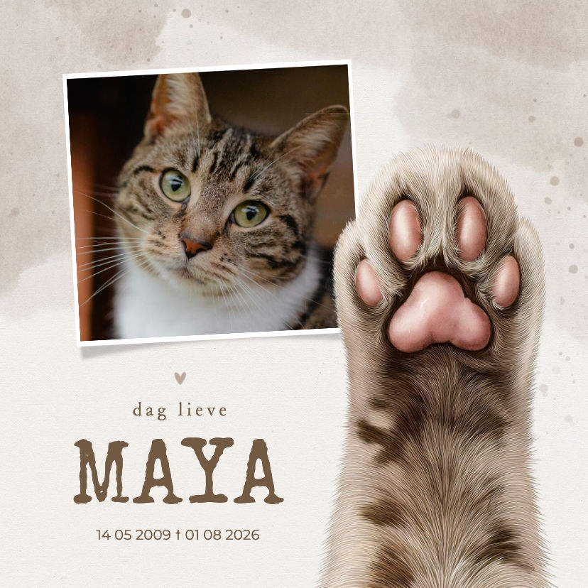 Tegeltje ter aandenken van een kat, met een foto en een illustratie van een kattenpootje.