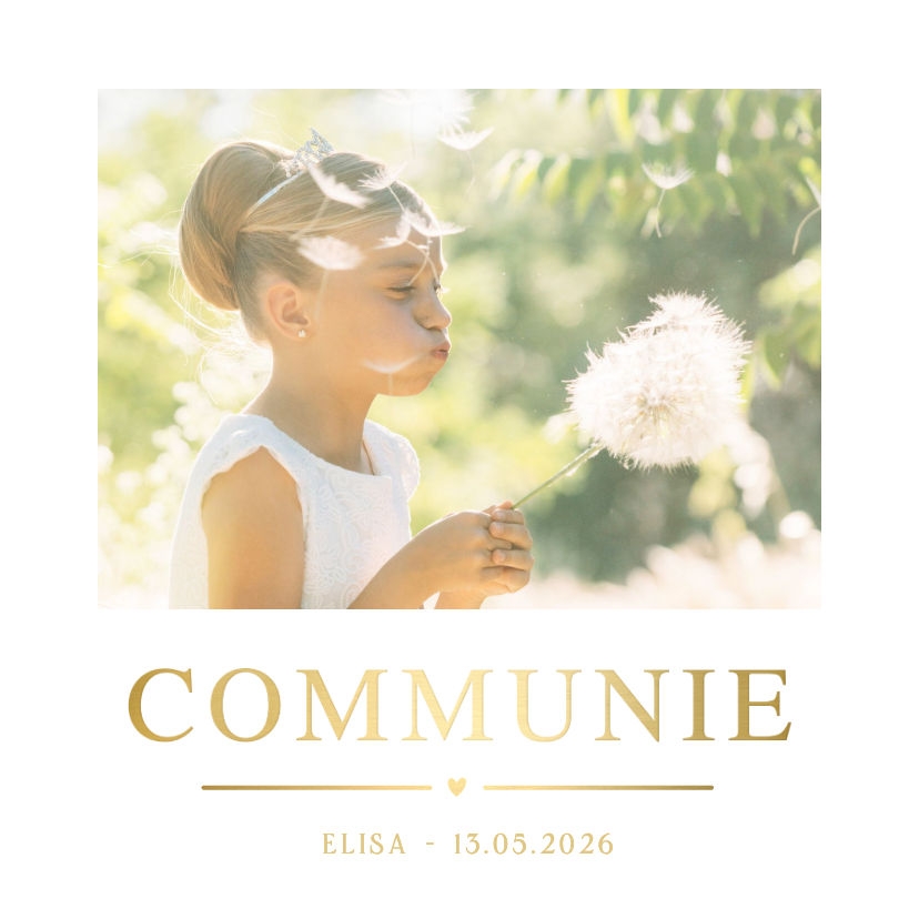Eenvoudig wit vierkant tegeltje met een mooie communiefoto, goudlook tekst, naam & datum.