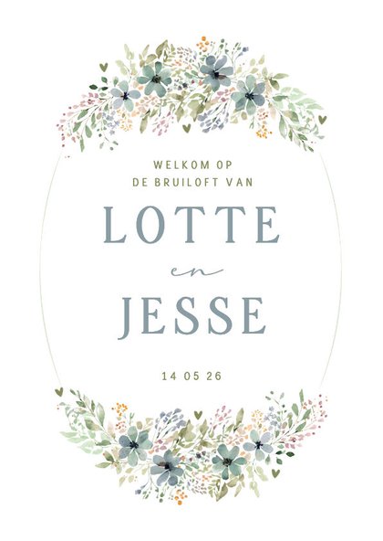 Welkomstbord voor een trouwerij, klassiek, met een ovalen kader van bloemen in zachte kleuren.