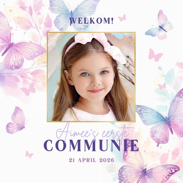 Lief welkomst bord met foto voor de communie van een meisje. Met waterverf vlinders in roze en paars
