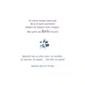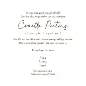 Een rouwkaart mag ook iets zeggen over het leven van je dierbare. Denk aan een passende quote, een liedregel, een gedicht, een levensmotto of een bijbeltekst. Ook een korte zin over het karakter of leven van je dierbare kan veelzeggend zijn. Je kunt zelf iets schrijven of kiezen uit inspirerende teksten in ons artikel over rouwteksten.