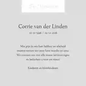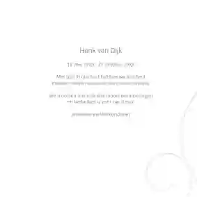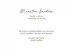 Na het overlijden van je geliefde brak er een roerige tijd aan. Er moest van alles geregeld worden, terwijl je veel verdriet hebt om die ene persoon die mist in je leven. Wat is het dan fijn om te ervaren dat er mensen aan je denken. Die bij het afscheid waren en op andere manieren voor je klaarstonden. Met onze bedankkaartjes na overlijden kun je ze vertellen dat ze van grote steun waren in een ontzettend moeilijke tijd.