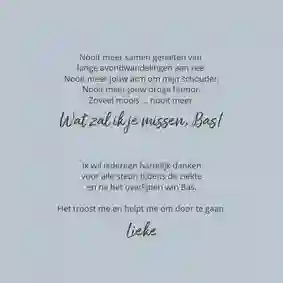 Het kan lastig zijn de juiste woorden te vinden voor het bedankkaartje. Met het volgende voorbeeld kun je het bedankkaartje na het overlijden heel persoonlijk maken.